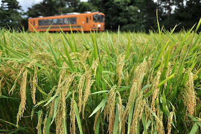 稲がみごとに実って頭を垂れた向こうに津軽鉄道の車両がやってきました。